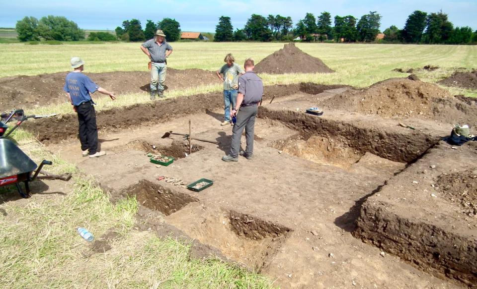 In July 2012 I received an email out of the blue asking if I’d like to take part in a Time Team in North Norfolk in August. Silly question really but could I get the time off work that was the thing. I was prepared to move heaven and earth to be honest to be there. I begged my work colleagues to cover for me and eventually I got three days off for the dig. A few weeks later I set off for Kings Lynn where the Time Team Academy were meeting up. We had a trip around the museum and saw the Sea Henge exhibition made famous by Time Team. It was fascinating to see close up. After lunch in Brancaster, we headed for site. All we knew before hand was that it was a large Roman site. We were greeted by Tim Taylor he explained we were searching for a ‘Saxon Shore Fort’ and we were all dispatched to different trenches. I went off to where Phil Harding was digging. His target was the Principia the administration block for the fort. That doesn’t sound very exciting but locating it would give us a good idea of the layout of the fort. Roman Forts all roughly conformed to the same plan and would also confirm the geo phys results provided by John Gator and his team. The geo phys was extensive and a very impressive amount of detail was visible, the results were some of the best seen on Time Team.