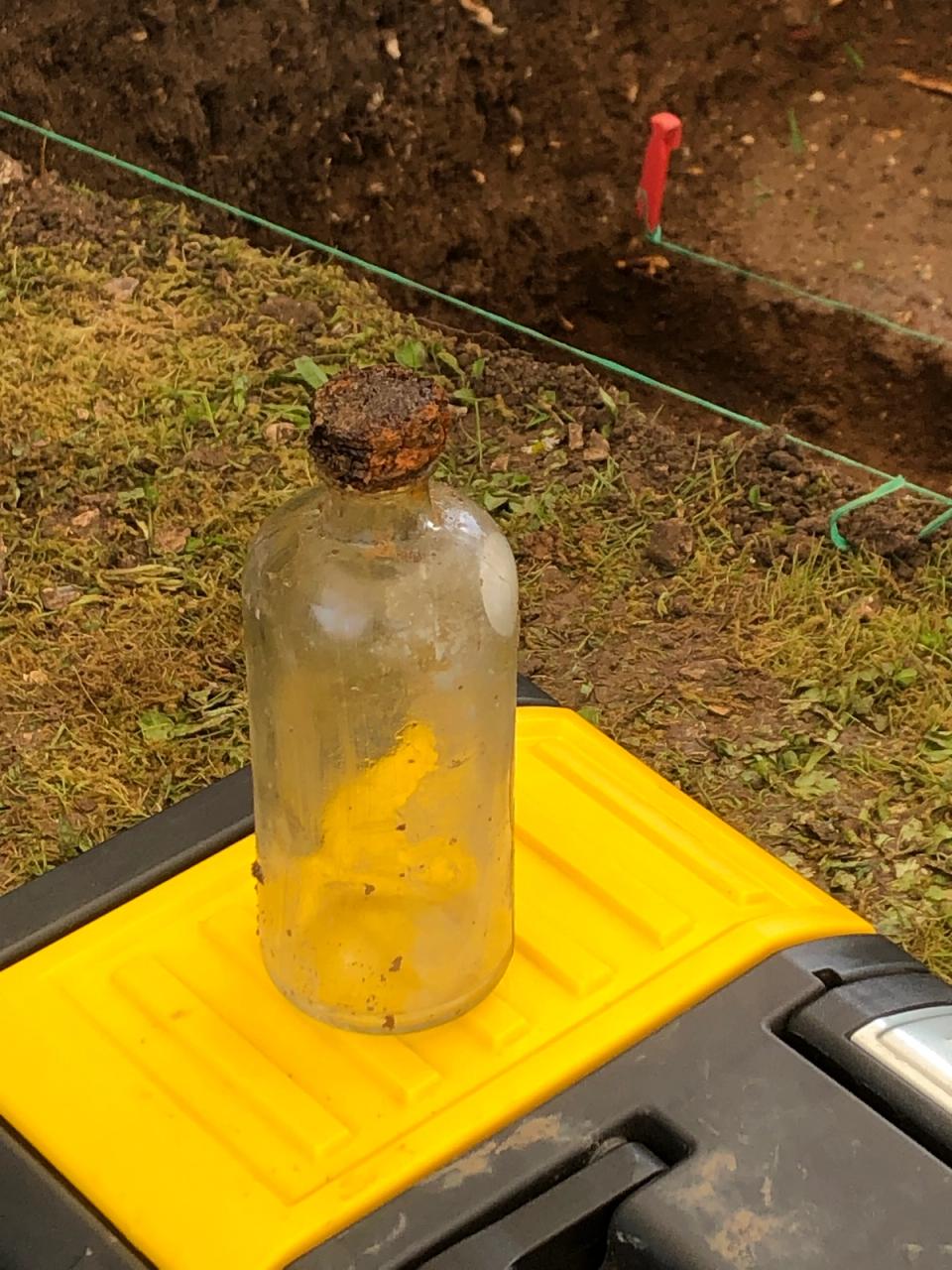 This was to be our last day. As I looked out of my bedroom window I sighed as it was typical Time Team weather, rain! After another wonderful full English breakfast at the Crown we headed over to site. We got to Penny’s test pit and the garden’s owners had put up a large gazebo which also covered our test pit- so rain wouldn’t stop play, hurrah! As we continued on with the test pit we found that the ‘charcoal’ was in-fact what was called tar paper. Which had been used in the Nissen huts as waterproofing, great news, this was evidence of the camp. But we had a problem: under the tar paper there was a house brick in the side of the trench and were there any others? So after consulting Richard Osgood we decided to extend the test pit a little as long as the householders were ok with it. We dug out another 30cm. As we got further down a large piece of tar paper emerged so I gently worked around it and under it. Then around the house brick and a bottle started to emerge. We stopped digging and phoned Steve Shearn, cameraman to come and film proceedings. So we dug on, it couldn’t possibly be intact could it, it could, wow. We thought it was a beer bottle as it looked very dark in colour but that was because of the soil we could see through it. It turned out not only to be intact but it had liquid in it and the stopper was in the end- miraculous! A medicine bottle which proved the location of the First Aid/ recreation hut. What a fantastic feeling to find that bottle which then featured in that day’s episode of dig watch, just brilliant and in the Time Team special. So time was marching on and we needed to get the back garden ship shape, for the owners, as they were having a Coronation party the next day. One last show and tell, then off to the pub. We did an end of day scene pub sat outside the Blue Boar which was good fun. In the evening we went to the local working men’s club to help give them a financial boost with our custom. There were loads of us in there, it was nice to have a drink and a chat with more of the people on the dig, locals too.