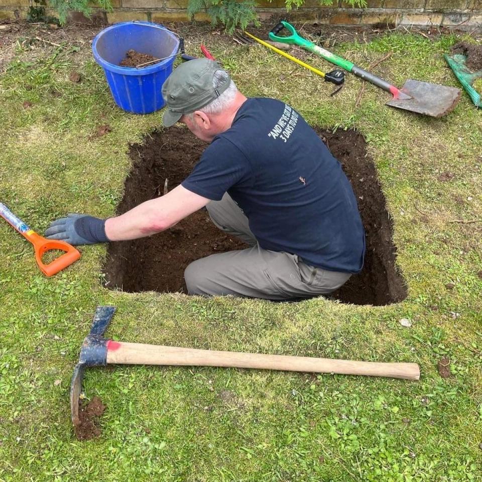 Back on site and John Dymond, was on site again. He told us he was friends with Phil Harding and he’d been to school with him many years ago. That was a nice link to Time Team; it’s a small world. We headed off to our garden and a warm welcome from Iris and a nice ‘cuppa’ to keep us going. The finds were petering out to nothing. Kenny and I assumed we were down on the natural and I went to see if we should close the test pit down but when I got back Kenny said “can you see the faint outline of a feature” and yes; I could see it! We decided to put a sondage in to see what we could find. Eventually we found a very rusty pipe associated with the pump house situated nearby and what looked like what was left of a large metal tin. Could be an old tin of paint. Once it was recorded and we did a piece to camera with John Gater who came over for a chat before he left the dig and headed home. He asked what colour the paint in the tin was? Rust colour I said lol, needless to say, it didn’t make the Final Cut! This test pit was now finished so it was closed down. Kenny packed away his tent, he was off to London to stand in the crowds and witness the Coranation. I on the other hand, went to help Penny, with her test pit. I met Ken Cisson a larger than life US Army Veteran. He’d been brought over by Operation Nightgale to take part in the dig. I whacked out a couple of ‘spits’ with the mattock, we needed to get a move on. We were getting a lot of what we thought was charcoal, evidence maybe, of a fire. There was a semi circle of ‘charcoal’ in section too, but time was flying by. It was time for another ‘show and tell’ and some great finds were coming out. A wheel, military ‘dog tags’, knives, all sorts really excellent stuff. The dig was progressing well. We went back to our pub in the village, washed and showered, then went to the Blue Boar Pub for dinner, exceptionally good it was too.