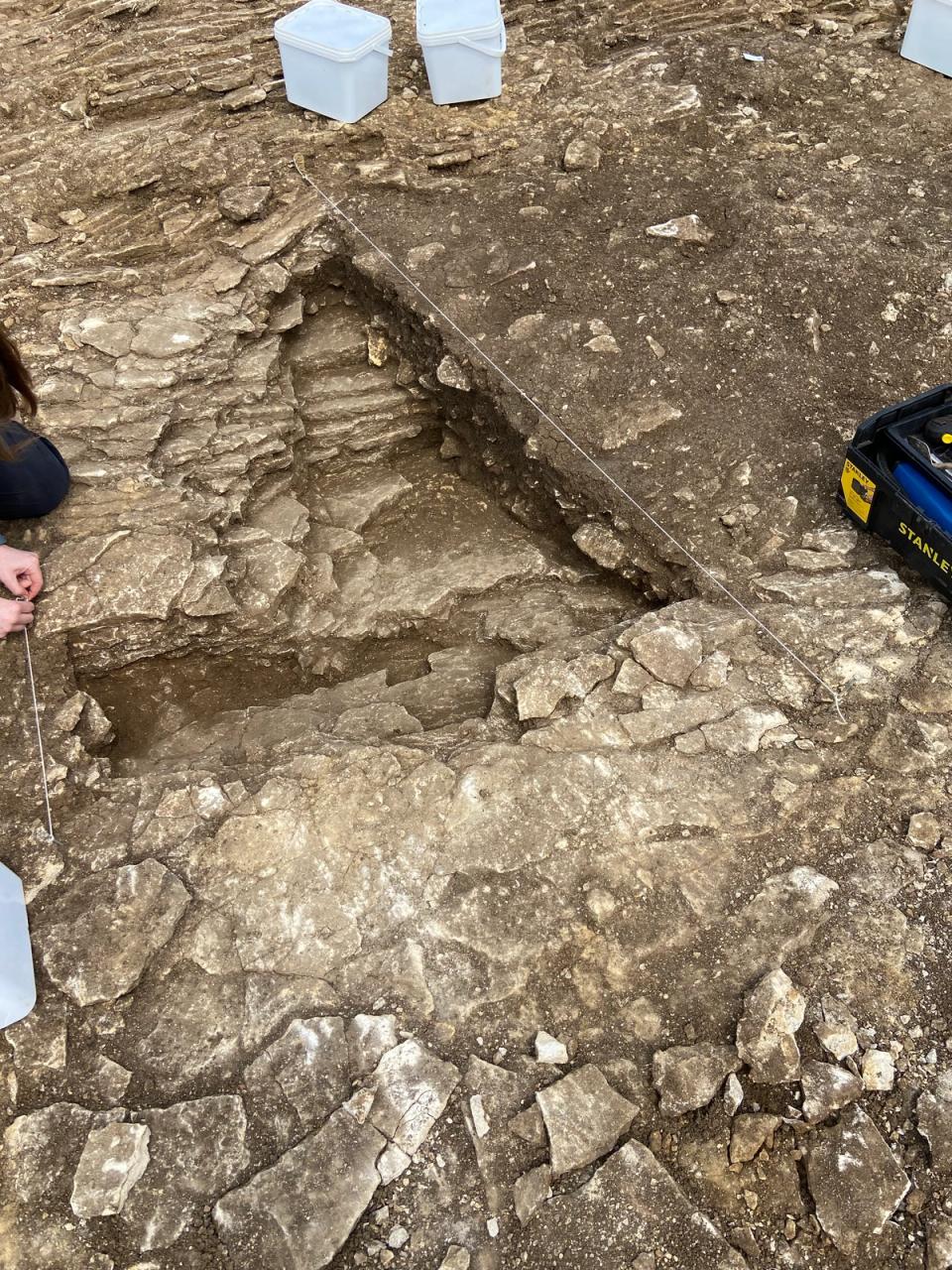 When we arrive on site on day 4 we do a quick recce and blimey do they have some great archaeology here. The weather is good but we hear they’ve had a lot of rain. Our eyes nearly pop out when we see Trench 1: an adult and a child’s skeleton, with fantastic preservation. It never fails to move me seening burials like this. Trench 2: a perfect circle in the ground it can only be a roundhouse can’t it? So we don’t muck about; after Richard briefs us we’re introduced to Matt Nichol of Cotswold Archaeology and he gets us immediately involved. My first task is helping clean back the trench to help show up the features in trench 2. I start on a very dark area which must be a pit. Then we are onto the natural, it’s very hard limestone in layers and covers a large area- it almost looks man made. We’re asked to avoid the pink stone in the middle, what is it a hearth: a funeral pyre? What ever it is, it’s intriguing. By close of play with a lot of hard work we’ve almost finished cleaning back the trench. As in Aldbourne most of the Military Vets are camping but a few of us have the luxury of an Airbnb in Tetbury and a night in the pub to look forward too, a great first day.