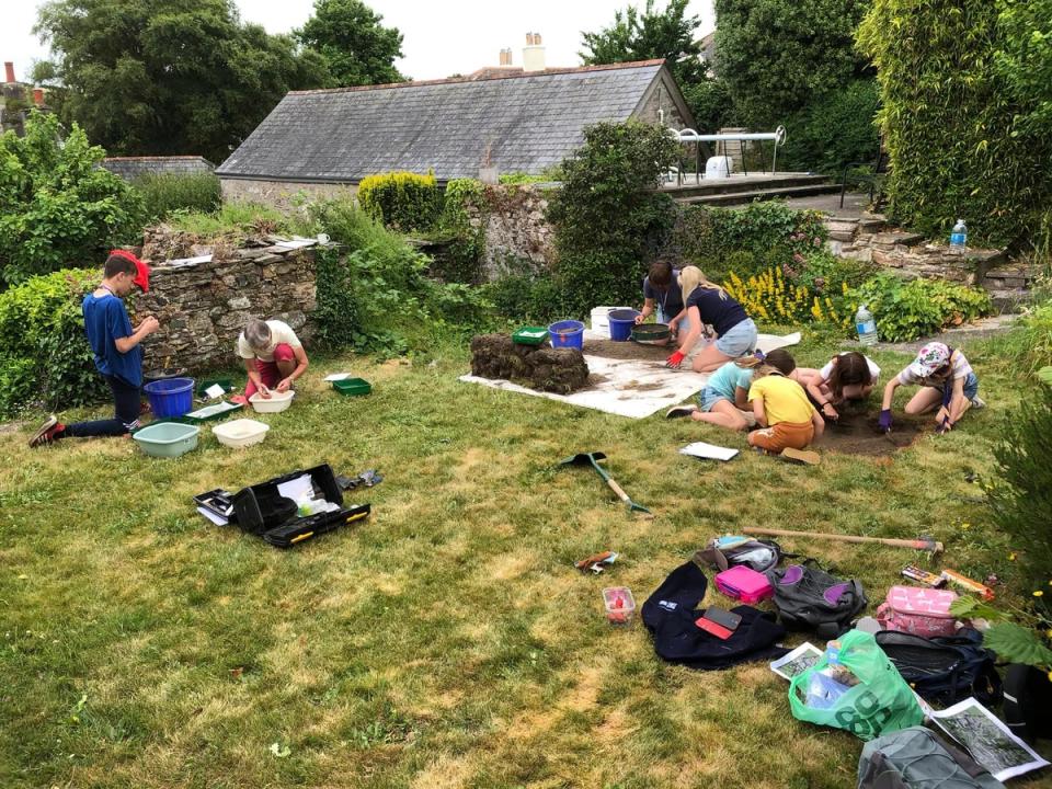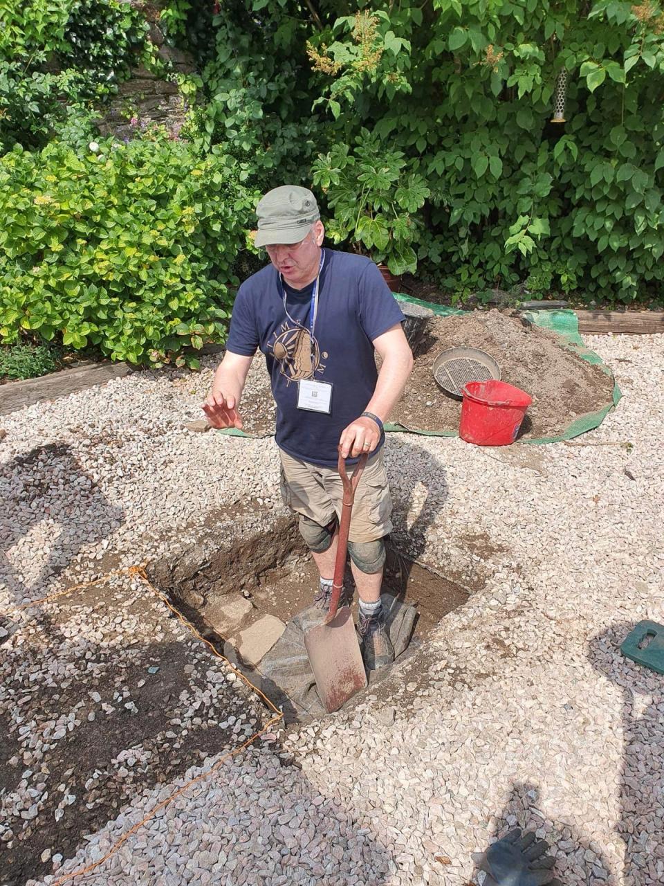 Up at 0600 for an early breakfast we need to be on site in Modbury for 8.30, a 30 minute drive away and parking we’re warned is a problem. We get there after a bit of a detour unsure of the best route and Simon’s unpredictable ancient sat nav, following the stars would probably have been easier. We get to the Village Hall and it’s a hive of activity everybody keen to find out exactly where they’d be digging. There’s a schedule but it often gets thrown out the window. It gets a bit more chaotic when the Villagers turn up with a million questions. The Town Crier welcomes us and Dani gives out instructions. We get our gear together and head off to the pub. No it’s not that bad we need a drink already but we’ve been assigned to dig a test pit in the pub beer garden, oh my days, my prayers have been answered! The Exeter Inn is our destination on the High Street. Down a narrow passage way we go and then my jaw hits the floor. The beer garden is covered in either white chippings or paving slabs I wasn’t expecting this. Where do we put this test pit? We decide on the pathway through the garden the least likely place we think to be disturbed recently. Meanwhile a camera crew turns up and we film a few scenes about setting out the test pit and then take advantage of the Gin bar to do a couple of skits for the Patreon’s and great fun it was too. Then Dani pops in to see how we’re doing and says I think over there at the back of the beer garden’s the best place for the test pit. So we move our stuff and start digging. We have a couple of helpers Sarah and Callum. We explain what we’re doing but are not encouraged by the landlord of the pubs comments about there being a lot of made up ground where we’re digging. After lunch Dani asks us to check on a few of the test pits in the High Street to see how folks are getting on. After a bit of advice, there was some confusion about how deep each context should be after taking the turf off. 10 cm if you were wondering! We gave them some encouragement then left them to it, they were making good progress. This eats into our digging time though so by the end of the day we haven’t got down very far we’ll need to get a move on tomorrow. Back in Plymouth we’re hot and sweaty but looking forward to a meal and a beer. There’s a good sense of camaraderie developing amongst this new team now oldies and newbies all getting along together with lots of laughing and joking.