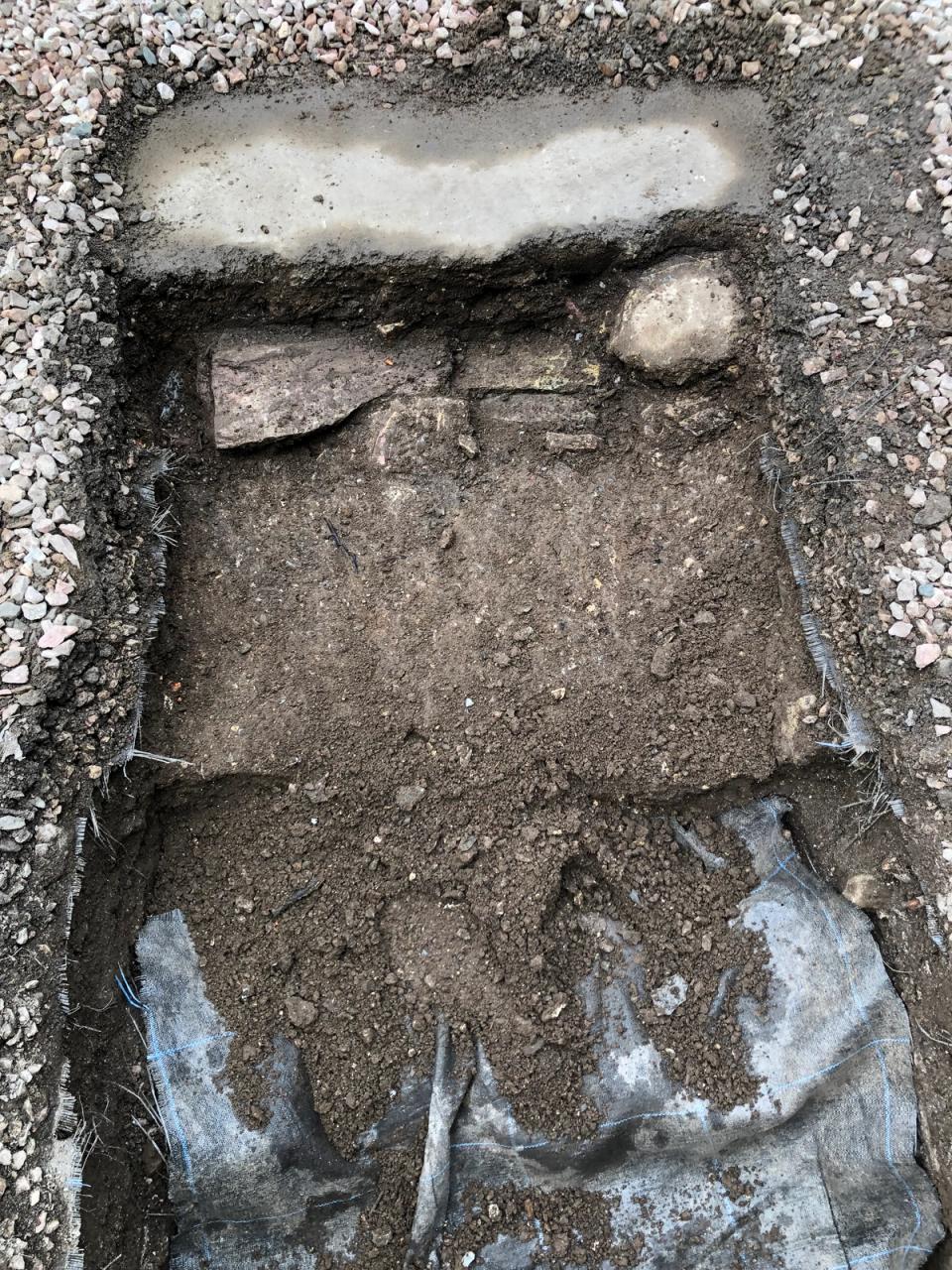 We get on site and after some explanations to the new helpers we assign tasks and crack on. We soon come across some large stones, is it a wall? We get advice from Pete Spencer he thinks it might be an entrance to a doorway as one stone looks worn under the weight of many footsteps perhaps. Then a little while later Carenza turns up to give her opinion. She thinks it’s a medieval wall built in line with the old Burgage plot boundary. This is often the way as you Time Team fans will know thoughts, ideas, theories change throughout the dig. We get some surprise visitors, Phil and Ruth old friends from Dunster who helped us on the Dig Village project. It was great to see them again but no time for chatting a film crew have arrived. This time Lucy does a piece to camera talking to Carenza about the finds we’ve got. Carenza advises us to extend the test pit but give it a new Test Pit number to keep it simple. So Test Pit 17 goes in and we immediately hit a layer of concrete, damn!